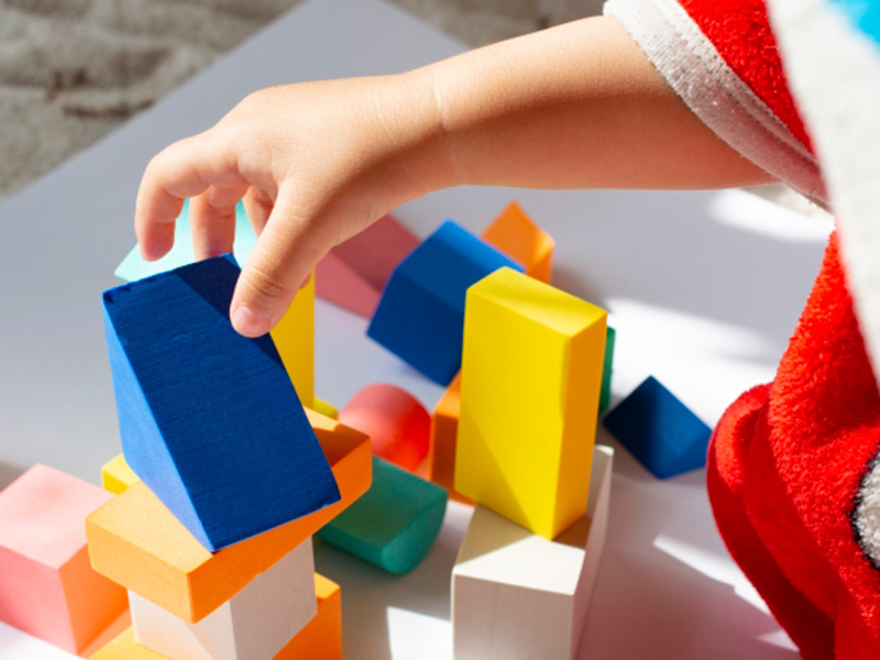 使用するブロックは独自構造で特許を取得した、すべての面に複数の穴があり縦・横・斜めに接続可能なもの。創造力を深く引き出せます。