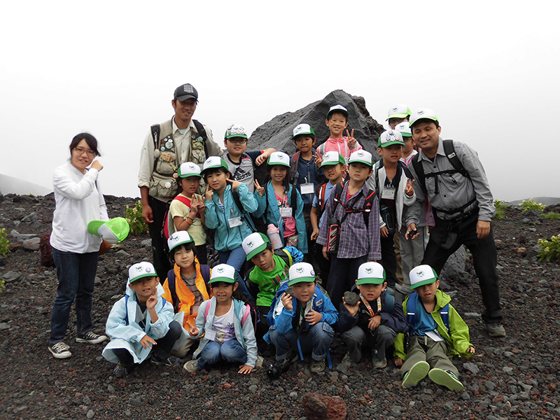 富士山5合目から、ホールアース自然学校の案内のもと宝永火口に登りました。本物の溶岩に触れた時の感動や、気圧の実験、片側にしか枝がない木などを観察しました。火口に到着すると、大きな岩に大歓声でした。