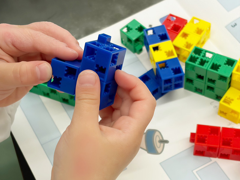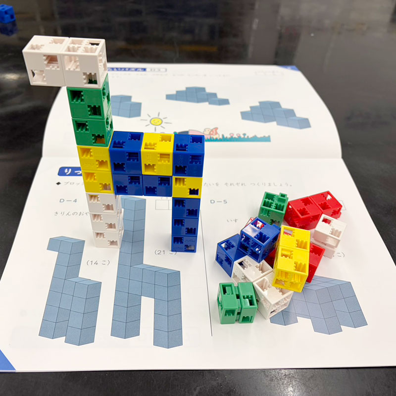 使用するブロックは独自構造で特許を取得した、すべての面に複数の穴があり縦・横・斜めに接続可能なもの。創造力を深く引き出せます。